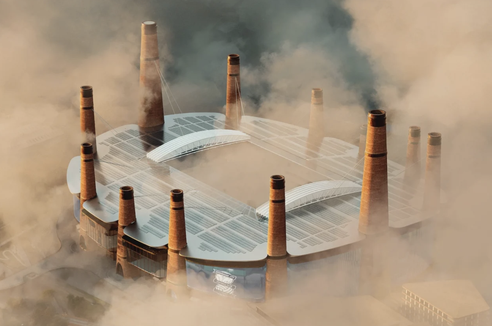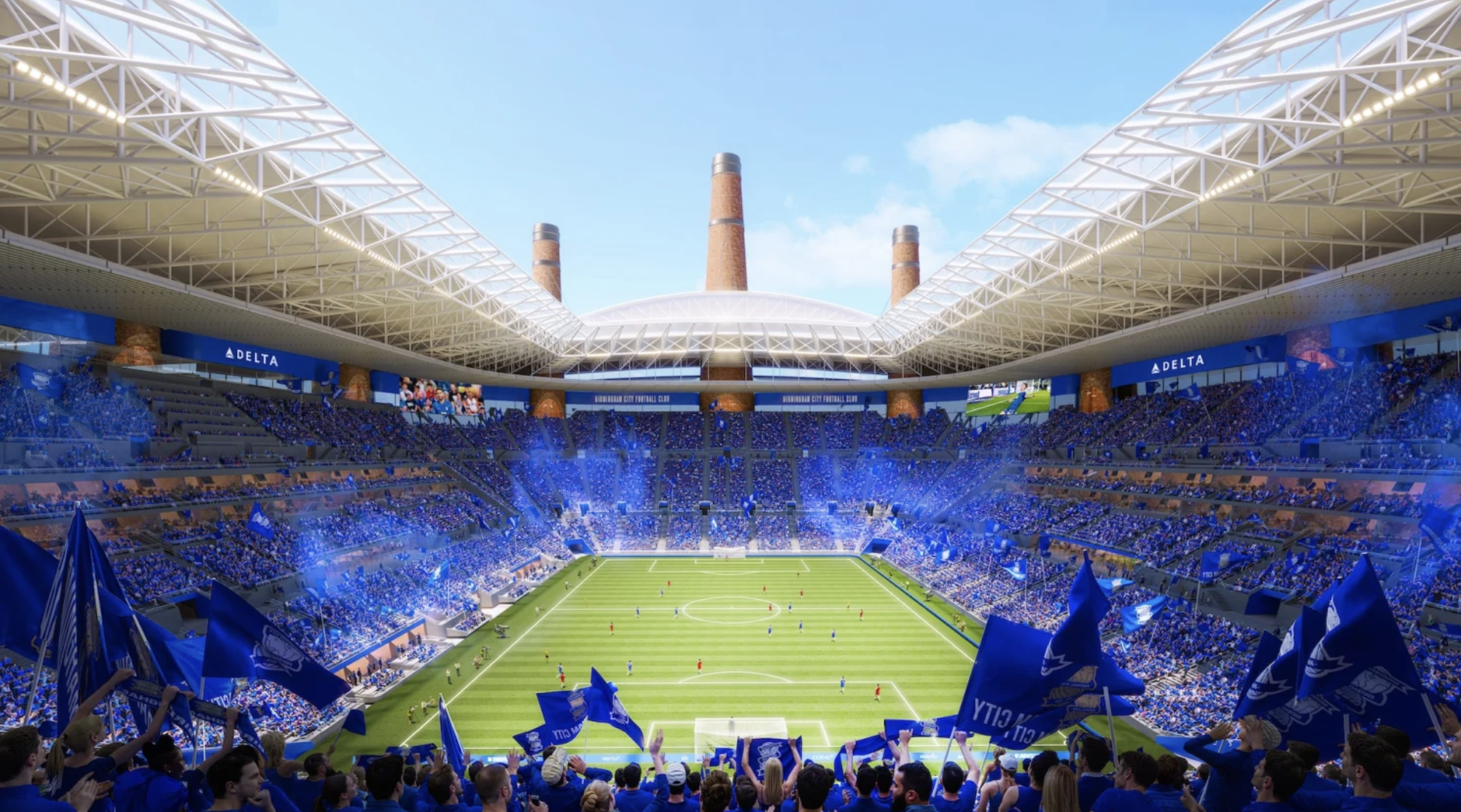 Birmingham City FC has lifted the lid on its plans for a new 62,000-capacity stadium featuring 12 giant chimneys-form structures supporting a fully retractable roof.