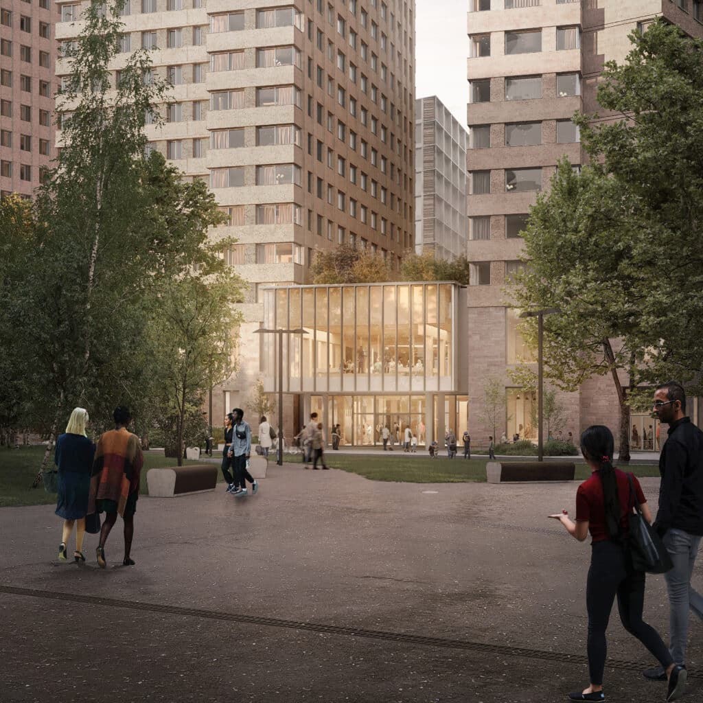 The project will replace the existing building with three linked towers rising 24, 26 and 28 storeys, delivering 1,945 rooms set around landscaped courtyards. Ground level will open up with new pedestrian routes, retail space and community uses.