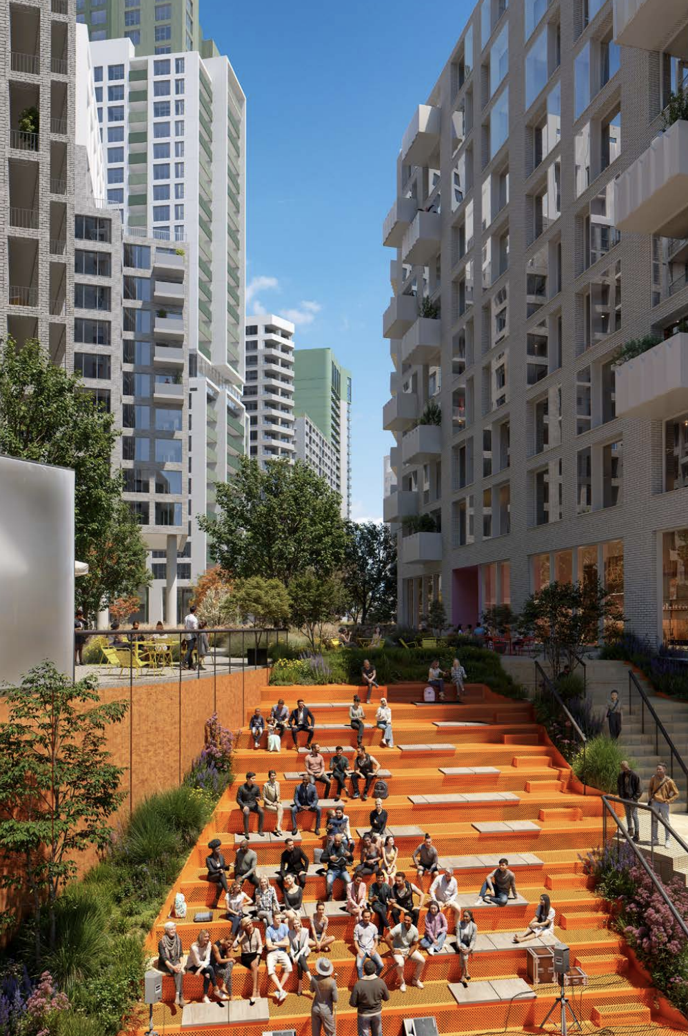 Landsec’s masterplan, designed by SEW, includes a detailed application for the first two residential buildings, designed by Mae Architects, Studio MULTI and Archio.