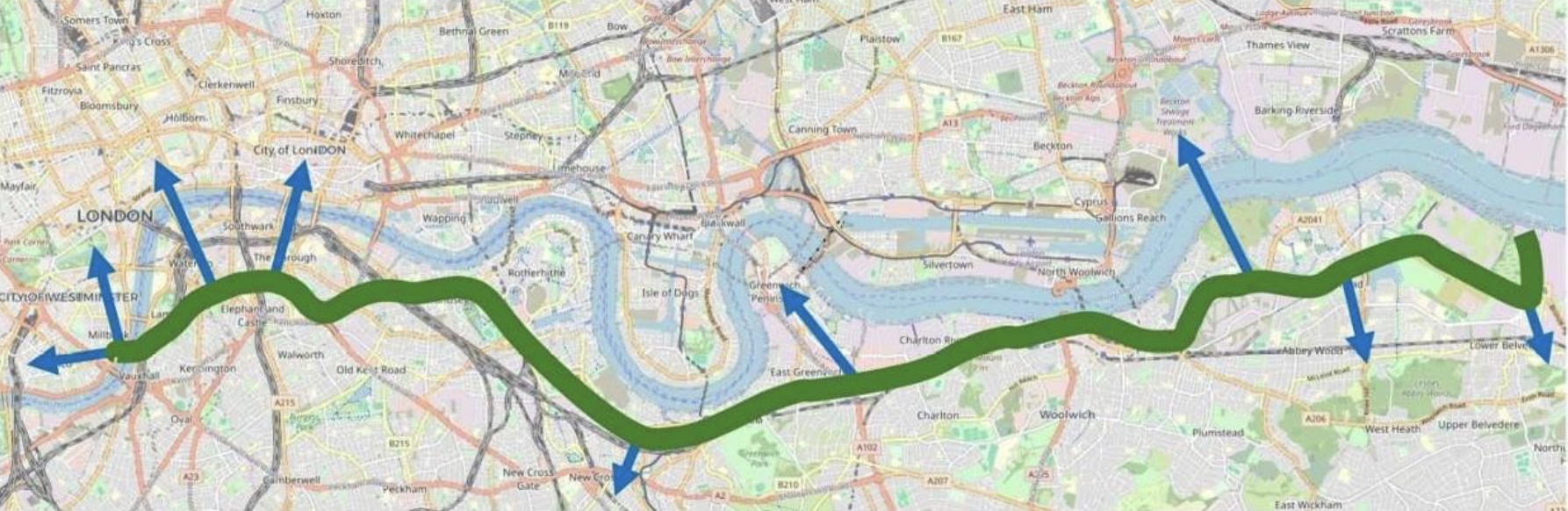 As well as acting as a direct heat source for large water-source heat-pump installations, the river corridor offers a route for big strategic heat mains running west–east along the waterfront.