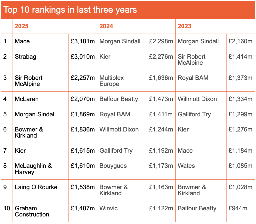 Austrian contractor Strabag’s UK business ran Mace close, finishing second after a transformative year anchored by the 110km Haweswater aqueduct upgrade for United Utilities, a programme valued at around £3bn in total.