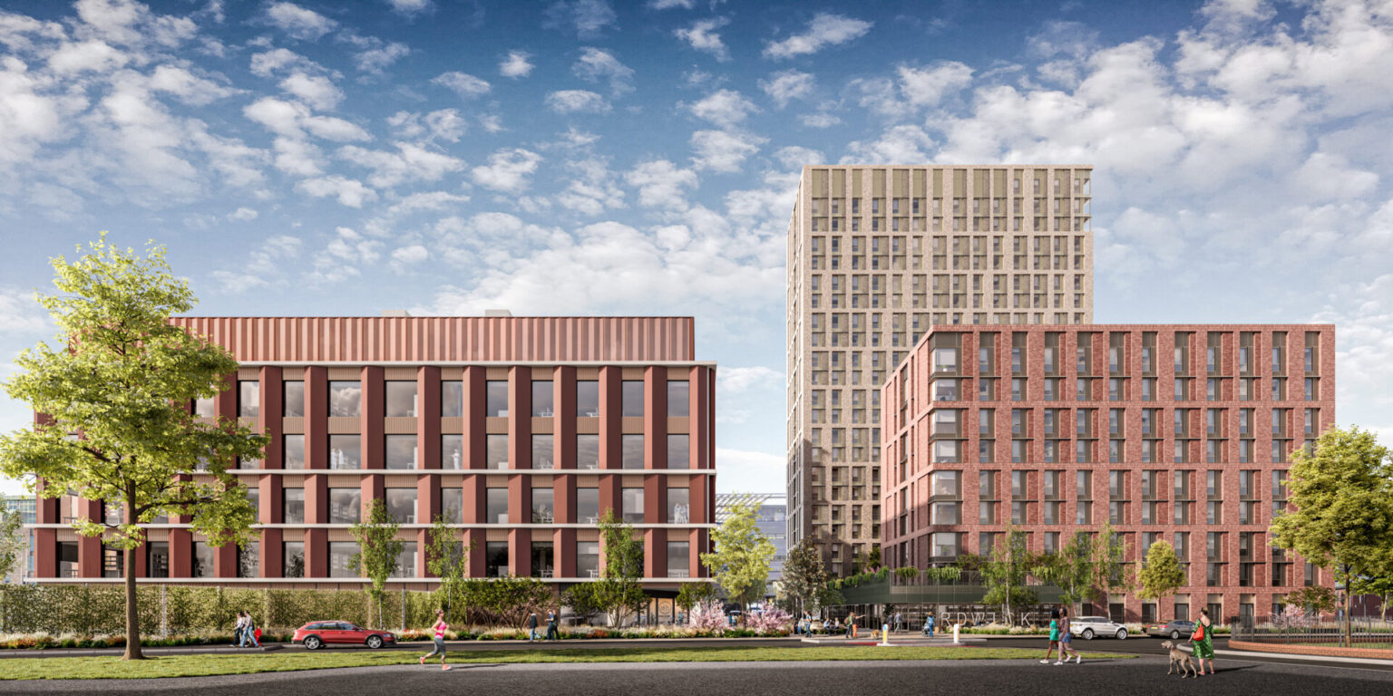 Rising to 9 and 23 storeys, the 273,000 sq ft development will pack in 288 studios and 449 cluster rooms, backed by a community hub, café, landscaped public realm and top-tier sustainability targets including BREEAM Excellent, EPC A and Platinum WiredScore.