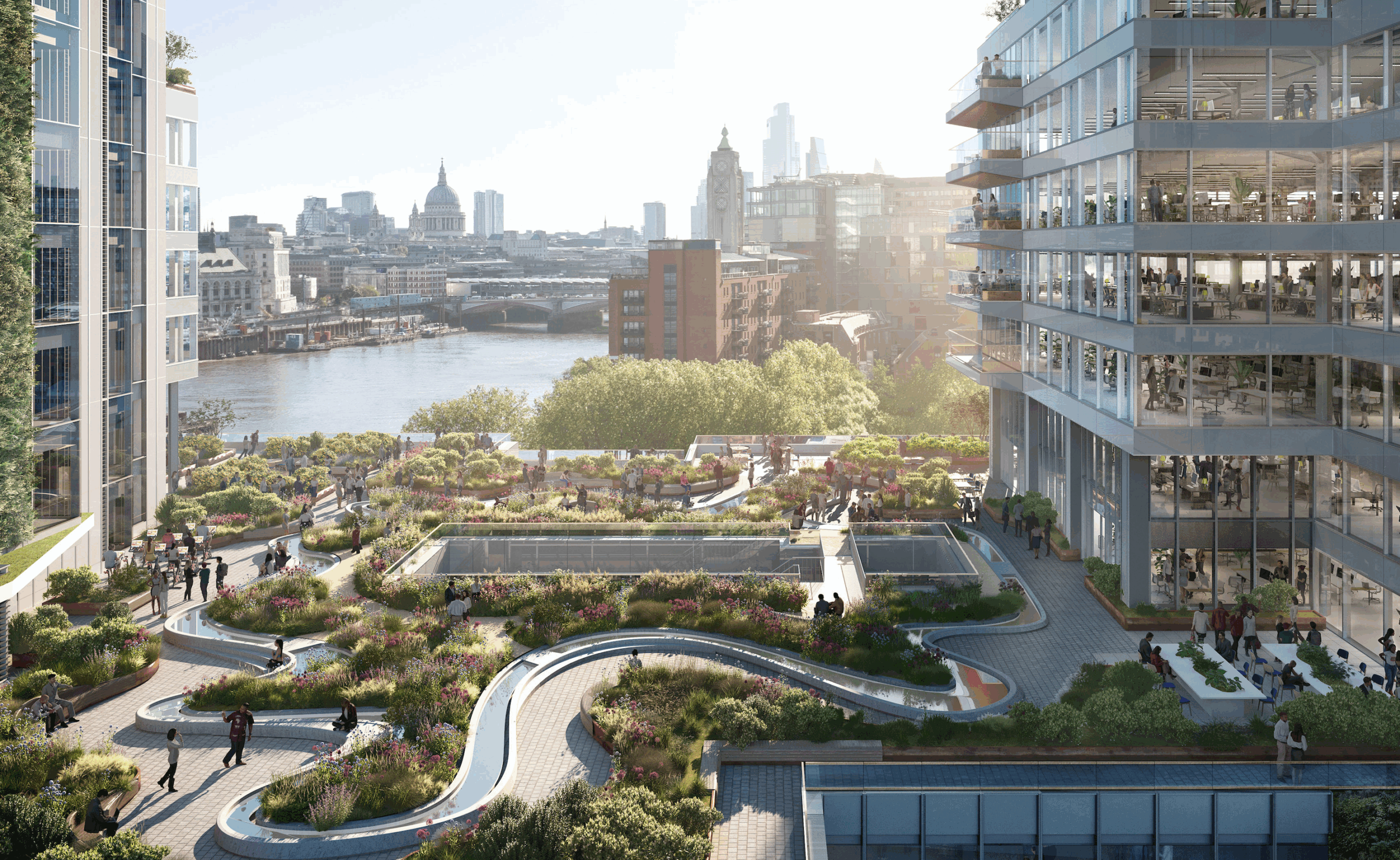 The design also features external terraces and balconies overlooking the Thames, and a new public rooftop restaurant and terrace, as well as transforming 40 per cent of the site into public space.