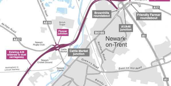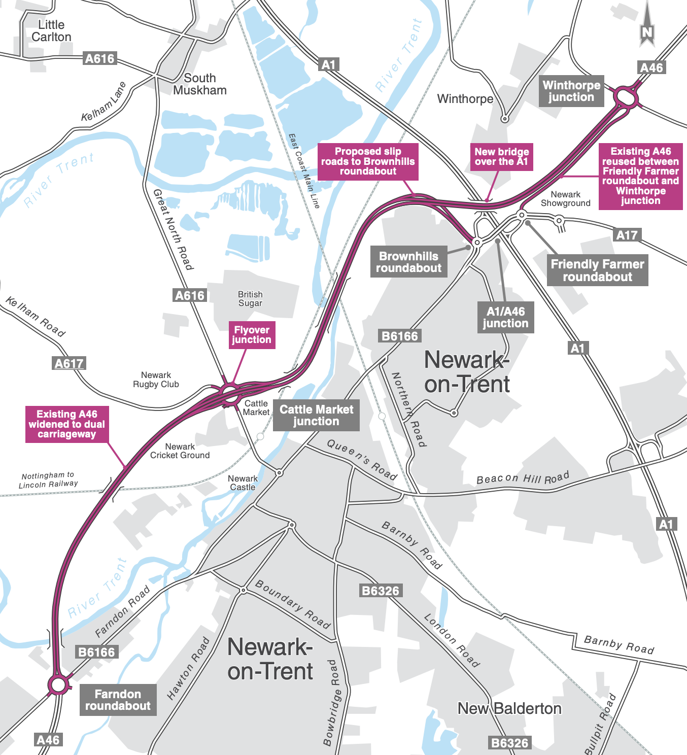 The scheme covers 6.6km between Farndon and Winthorpe junctions. Most of the existing road will be widened, while a new offline section east of the A1 will cut out one of the region’s worst traffic bottlenecks.