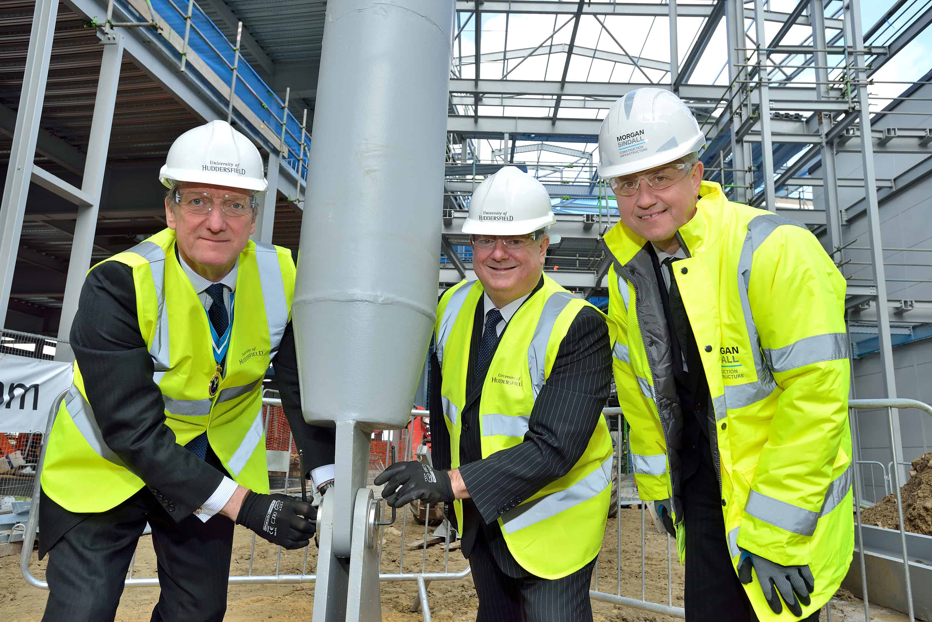 On this occasion, however, the “topping out” took place at ground floor level as one of the twin trusses that will act as a frame for the main entrance to the building and support its roof was manoeuvred into a steel “shoe” that will anchor it. A stainless steel pin was then inserted and tightened by the Vice-Chancellor of the University, Professor Bob Cryan, the High Sherriff of West Yorkshire, Mr Chris Brown – who is also chair of the University Council – and Mr Pat Boyle, who is MD of Morgan Sindall Construction Infrastructure, the projects main contractors.