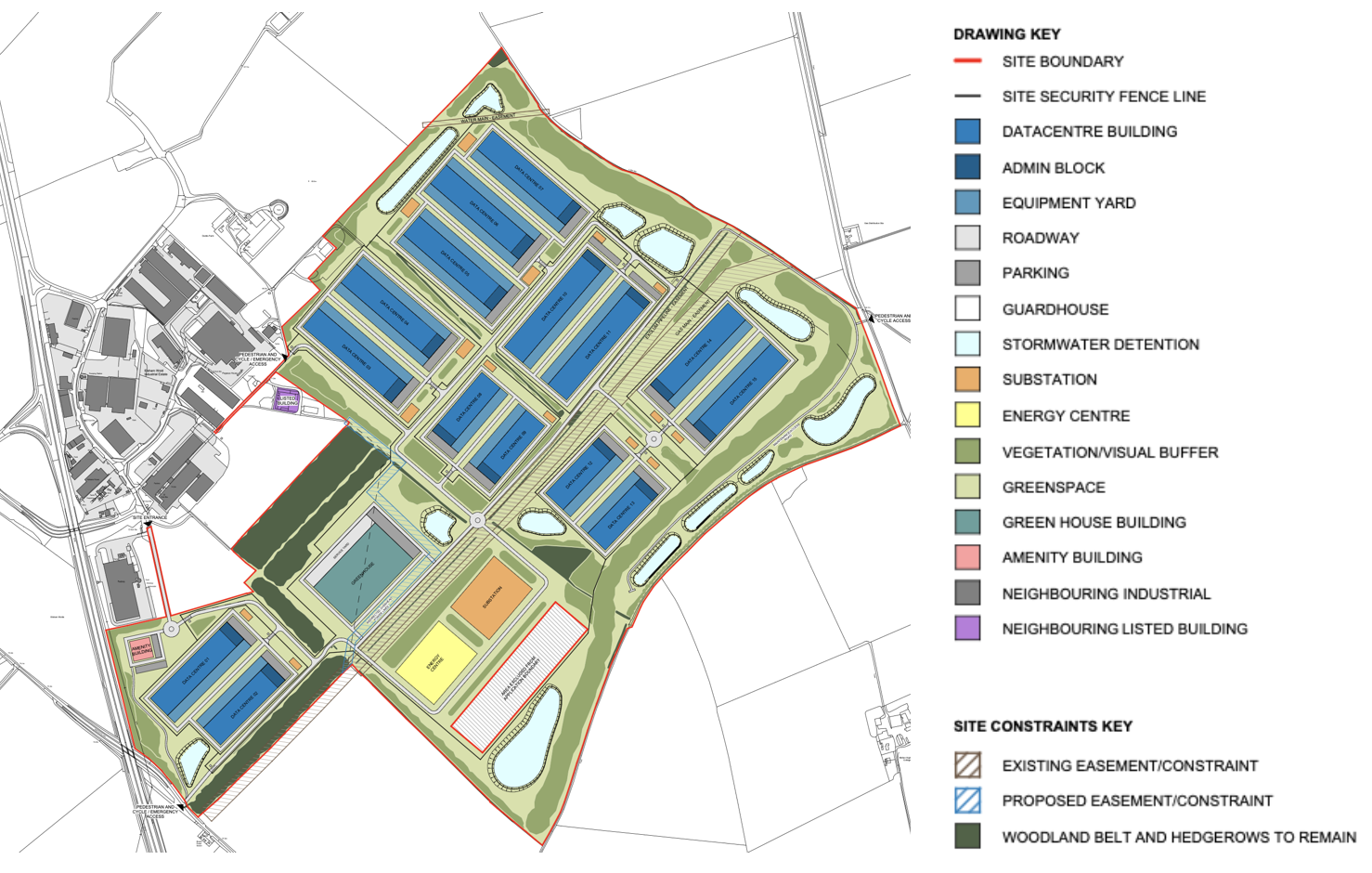 Buildings across the campus would range from 7m to 23m in height, supported by extensive landscape bunds up to 10m high, plus woodland planting belts to shield views from the surrounding countryside.